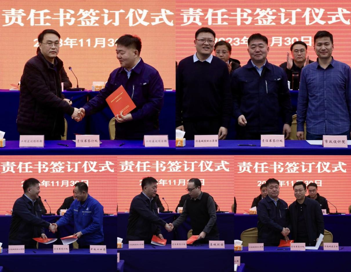 责任书签订环节,工程建设指挥部总指挥与工程建设项目部负责人,工程建设项目部负责人与各参建单位负责人分别签署《安全文明施工责任书》《工程质量责任书》《保障农民工工资支付责任书》《工程廉政责任书》;随后,工程建设项目部负责人和各参建单位代表逐一进行了表态发言。