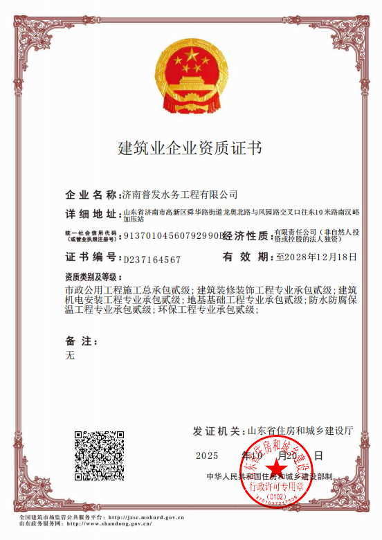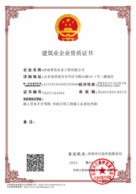 2023年12月4日,济南普发水务工程有限公司取得市政公用工程施工总承包贰级资质。
